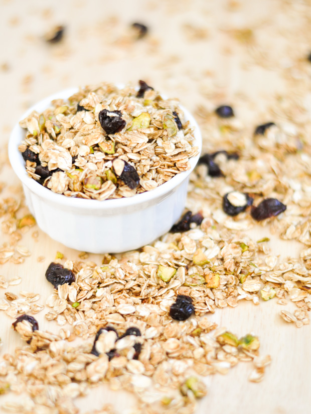This Granola is a combination of some of my favorite flavors – Dried Cherries always make me happy and Pistachios are quite a delight in my book.ย This is a very simple and easy to make recipe I made the slightest adaptions to from Zoe.ย It is really versatile, it can be a topping for yogurt or mixed into a fruit salad for a great start to the day.